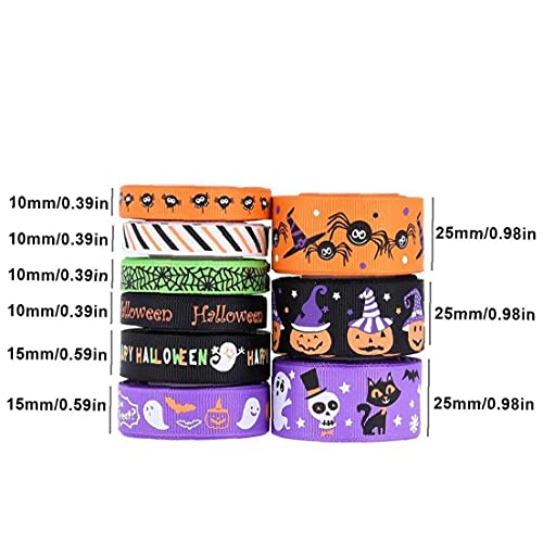 Je krijgt: je krijgt 9 rollen Halloween bedrade randlint en elk van hen heeft verschillende patronen. Er zijn 3 soorten breedte, 0,39in, 0,59in en 0.98in.